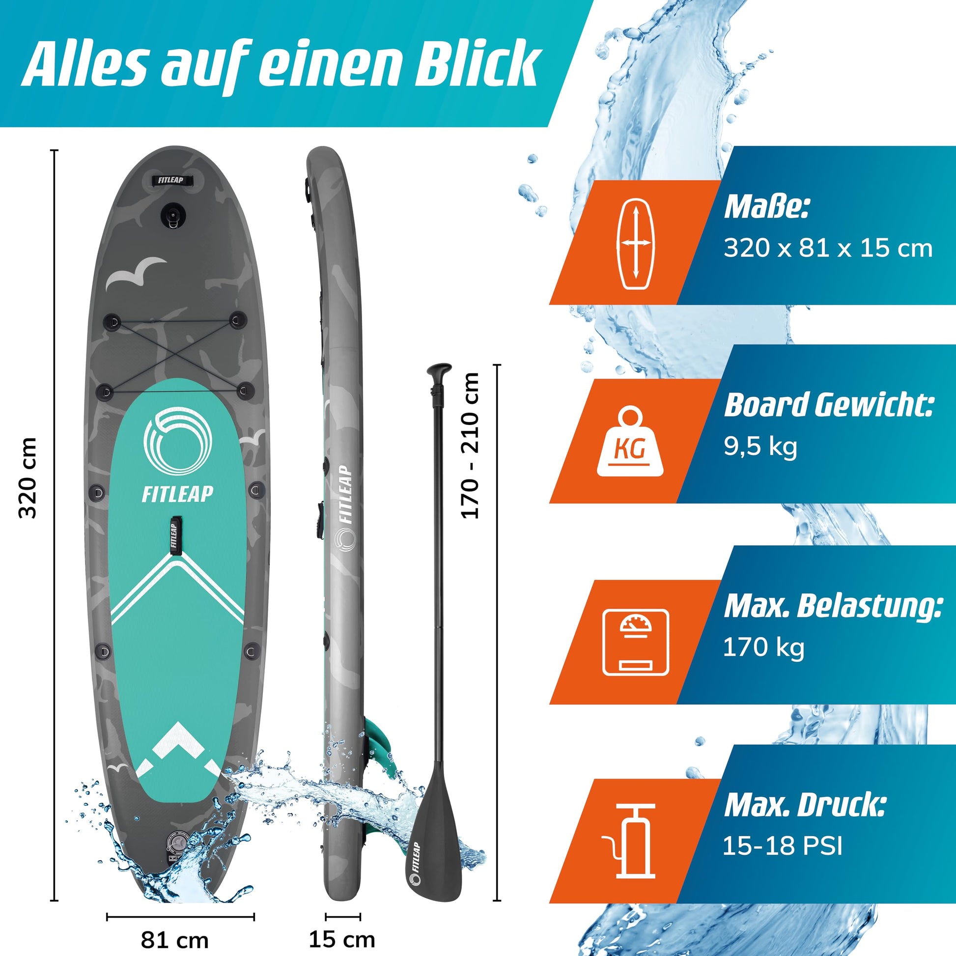 Fitleap Premium Stand Up Paddle Board aufblasbar - SUP Board Set mit Hochdruckpumpe, verstellbarem Paddel und Rucksack - Ideal für Anfänger und Profis - Perfekt für Yoga, Surfen und Wassersport
