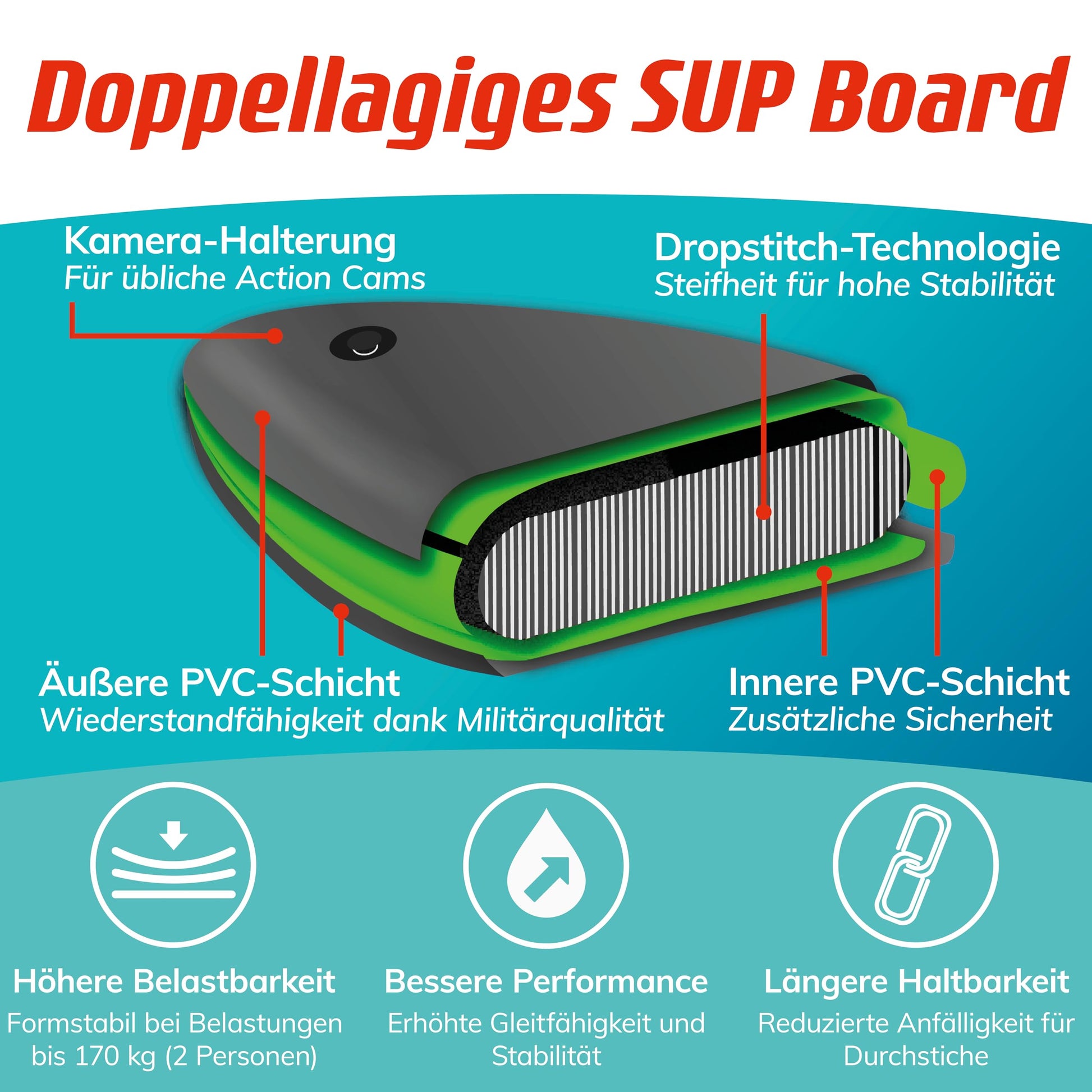 - HOCHWERTIG: Das aufblasbare Stand-Up Paddle Board bietet ultimative Stabilität & Langlebigkeit. Perfekt für alle Wasserbedingungen - Seen, Flüsse und auch Meereswellen