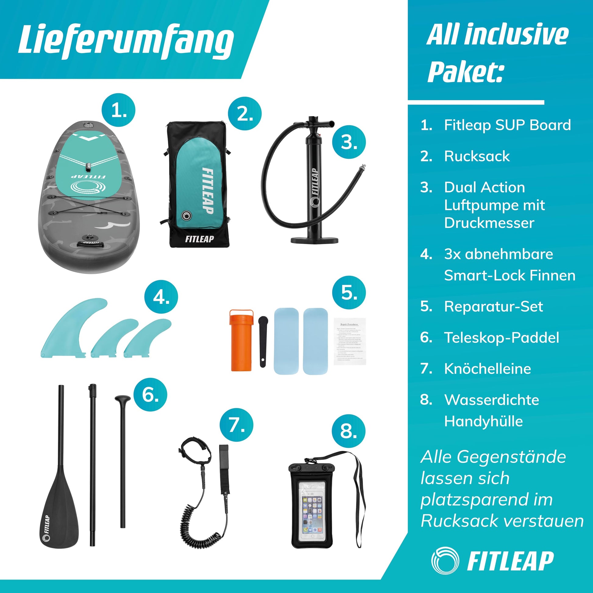 - KOMPLETTES SUP SET: Erhalten Sie ein verstellbares Paddel, eine effiziente Hochdruckpumpe, einen praktischen Rucksack, eine wasserdichte Handytasche und ein Reparaturset. Ideal für Anfänger, Profis und Wassersport-Enthusiasten